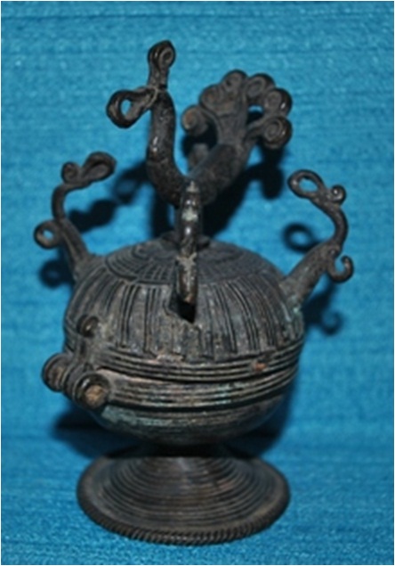 Brass sindurdani The main shape of the sIndurdani is of a shape. The base is round. At the top is fixed a brass peacock made in a stylized form. The peacock is surrounded by four abstract forms leaning towards the peacock. Around the feet rather sign stand of the peacock is a zigzag line boarded by a circle.
