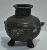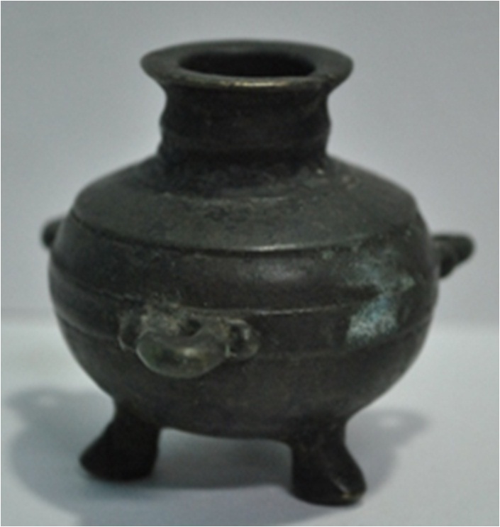 Its shape is spherical like a tripod. It has three legs, but these are quite small in size. There are three rings like form welded to the other part of the inkpot. These are at equal distance from each other.
