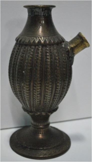 The main shape of the hukka is that of coconut, which is ornamented with vertical lines and leaf forms in relief. This form vests on a pedestal with circular base. At the circular base also there are engravings showing bird forms.