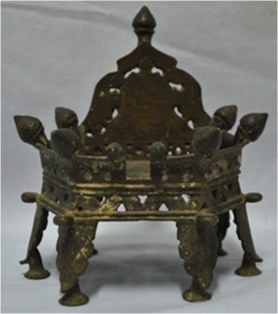 Brass Chauki stand with six legs. The chauki is empty. There are eight knobs and four hinges around the chauki.