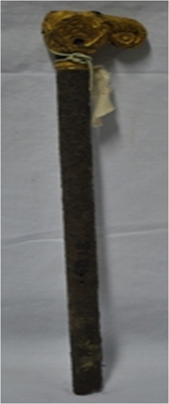 One iron rod with decorative head the head portion is gold plated . There are decorative motifs on the iron rod.