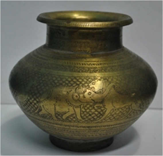 Brass Vessel Lota The base of this brass vessel is circular. It is decorated with several motifs. The lion is attacking the elephant. Some human and bird figures are also incised on the vessel. A small line in takri is incised on it.