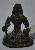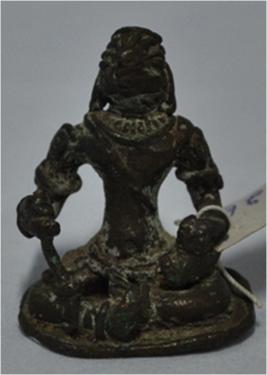 This copper sculpture represent a yogi . He is holding a standard like object in his right hand and some utensils in his left hand. His hair are gathered in the shape of a bun at the back of the head.