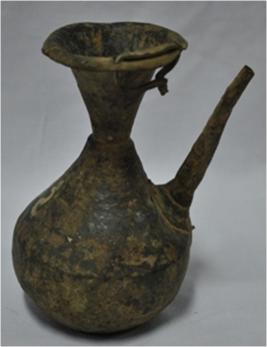 It consists of a base spherical body and a narrow upper part. A curved spout is attached to it and also it has a small ring attached near the opening for carrying the utensils.