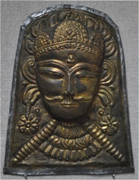 Brass mask bearing a male face with moustaches. It depicts, most probably the god Surya Sun god . The mukuta has three parts. Below the neck the shoulder form a triangular shape. The broadest side is at the base.