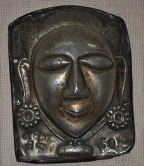 Silver mask of Devi. The goddess is shown wearing crown bearing floral ornamentation, flower shaped ratna kandalas & a small & simple necklace with a drum shaped pendent.