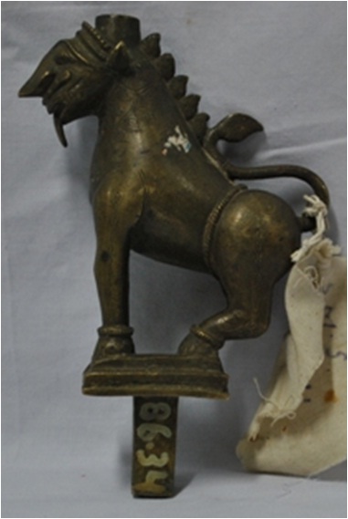 He is standing on a pedestal and wears necklaces and anklets. The hair is stylized on the forehead. The mansi are shown on the neck with five projections and is attached with the end of the tail. Tongue is shown coming out of the mouth. There is a big hole on the head. Which shows that some other object was fixed on it