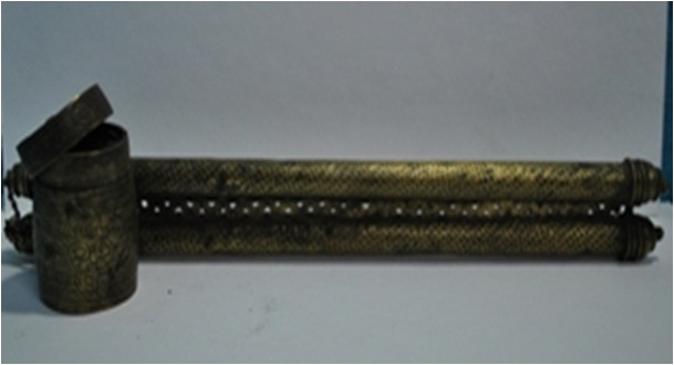 Pen stand with inkpot. It has double brass pipe which is welded together. On the right side inkpot is fixed for store the ink.