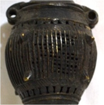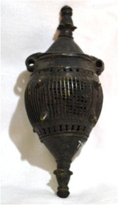 Brass vessel with a lid and hinges. Its shape is like an egg with rod like ends.
