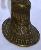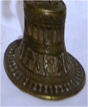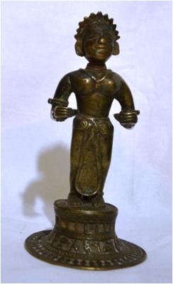 Brass lamp handle with a figure. The figure is shown standing on a round pedestal having a round broader base. The arm held at the level of hips have holes to hold the lamp. At the back is handle made of thick brass wire. The bun of the figure has conical shape.