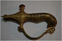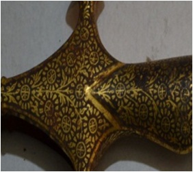 Sword hilt with golden inlay work. The end of the handle look like the head of a bird.
