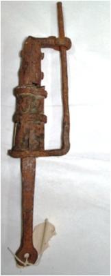 | Description / विवरण | Old lock. It is made of iron. The main body of the lock is like a cylinder with three round ribs and one straight iron rod is fixed to it. This rod enter a round socket when the lock is on. It is rotated in a special way to fix the lock. |