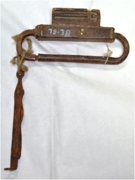 | Description / विवरण | It is composed of oval and rectangular shapes. The levers of the lock are welded in the rectangular form. It measures 17.5cm. It has two parts, one part is flattered at one end and is round in shape. It is fixed with a nail on the other part. |