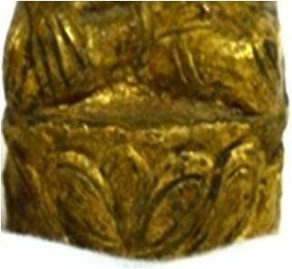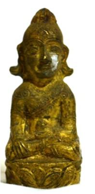 One Brass figure of Buddha The Buddha is shown seated in Padamasana . He is holding a lotus flower in his left hand and his right hand is resting on his right leg. The face is serene.