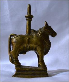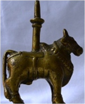 Brass Nandi It is shown standing on a rectangular pedestal. The tails is long and touching the legs.