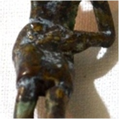 Bronze probably a part of a handle. A female figure is shown with a basket over her head. She holds the basket with her right hand and the left is akimbo. The lean body is shown bent at the waist and the knee. Modelling is simple but effective.