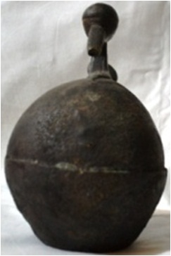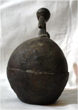 Oil container of the shape of a duck. Metal used Brass. The main figure i.e. excluding the stopper is cast in three parts. Head cast separately is attached at the top. Over the back there is hole with stopper with threading to be used as screw type.