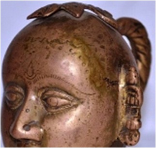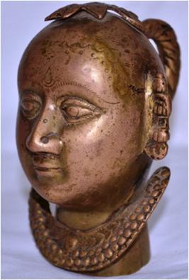 Brass head of a lady Maharashtra . An ornament appears over the head. A hansli type ornament is attached to the neck. Some ornaments or flower appear with the ears. A small hole is pierced at the left portion some ornamentation is done at the head, suggesting hair & eye brow etc. a mark appear at the centre of the forehead.