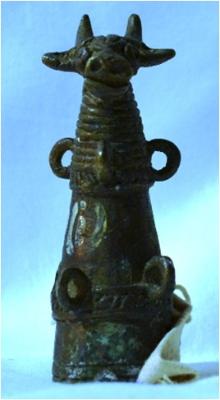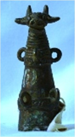 Art object with animal heads Brass . It is cover of flask of ore. It is hollow within. Two holes are also there.