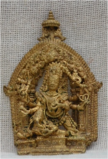 Brass image showing Mahakali with six arms each attribute in each hand . She is shown trampelling the god Ganesh. The torana has Budhist motif in her relief. Over the head of Mahakal is Kirtimukha . At the top of the toran is parasol.