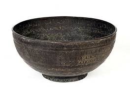 | Description / विवरण | An inscribed bowl of copper bearing Persian inscription on inner side and floral and diamond shape design on outer surface of the bowl with one line circular size inscription at the bottom. |