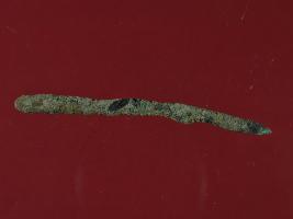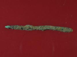| Description / विवरण | Trench XQ-1, Qdt III, layer 2, depth 235 cms This is a copper rod. Hard patina is deposited on it. It is badly corroded and deformed. Color is greenish. |
