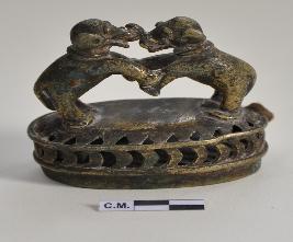 | Description / विवरण | A rattle in the shape of wrestling elephant with an oval hallow base, decotated with filigre works. |