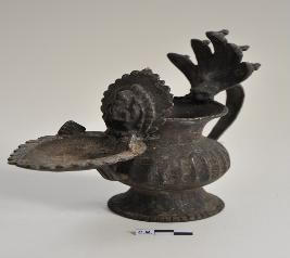 | Description / विवरण | Snake Lamp, used for ritualistic purpose by the baudhs of Orissa.The lamp is fixed with miniature container.The other interresting addition is the image of Ganapati having four armed and seated on the behind portion of the lamp. |