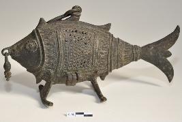 | Description / विवरण | A casket in the shape of a fish with a box on the back for susoension.The casket is decorated with filigree works. |