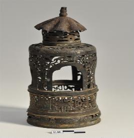 | Description / विवरण | Miniature lamp stand in the shape of a minar with four windows.The entire lamp stand is ornamented with filigree works and divided into three separates parts. |