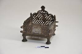 | Description / विवरण | Miniature Throne with four legs and a proportionate gateway.The centre of the throne is ornamented by the depiction of a full blown lotus motif. The throne is provided with a couple of hooks on all the four corners to raise a canopy over the deity with the heap of matal poles.It is probably use to contain salagram sila, A form of Narayana . |
