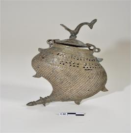 | Description / विवरण | Bronze csasket in the shape of a mango, with filigree work.The peacock lid is not of this casket. It belongs to a smaller casket. |