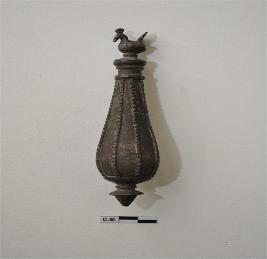 | Description / विवरण | Casket in the shape of a jhinga. Stylised screw-lid with peacock top. |