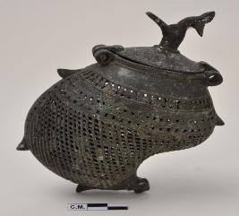 | Description / विवरण | Bronze Decorated item in the shape of a mango with filigree works.The lid of the container is missing. |