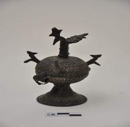 | Description / विवरण | Vermillion Container p;erched with peacock. |