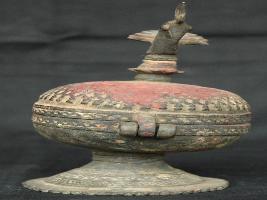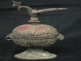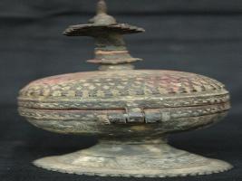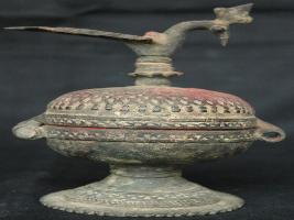 | Description / विवरण | A well decorated sindoordani with peacock head openings. Thin layer of patina is shown in lower portion. |
