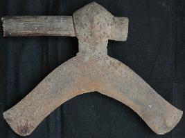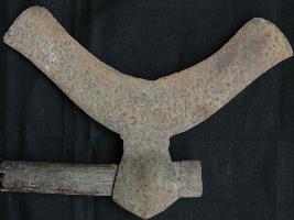 | Description / विवरण | A tangi with wooden handle is covered with thick coat of rust, used as armament. |