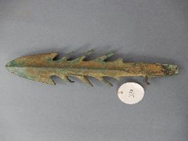 A denticulated harpoon with slightly raised mid-rib. Four nos. denticulation on either side.