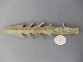 A denticulated harpoon with slightly raised mid-rib. Three sharp denticulation on either side and one subsided denticulation on either side at lower end.