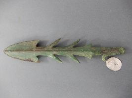 A denticulated harpoon with three prominent denticultion on either side andfourth lowest denticultion less projected . Mid -rib slighly rising.