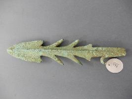 A denticulated harpoon with three prominent denticulation on either side . The lowest denticulation less prominent, mid -rib slightly raised.