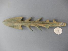 A denticulated harpoon with three denticulation prominent and sharp on each end. One -fourth slightly small midrib slightly raised