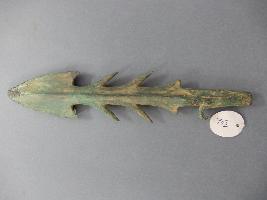 A broken denticulated harpoon with two denticulation on either side, sharp on each end. The fourth one less projected. Midrib less prominent and one denticulated bent in curved