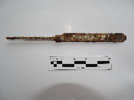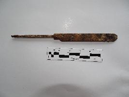 A heavily rusted knife blade with handle missing. It has an oval head with one edge sharpened & other is completely blunt. The pointed back was probably fitted into a back made of another material, which is missing.
