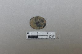 | Description / विवरण | It is a fragment of an unidentified object. It is made of copper. It is oval in shape. It has incision marks on one side the other side is plain. The side with the incisions has an oval outline inside which there are characters. It has an even thickness. The side with the incision is smooth, the other side has a rough surface. |