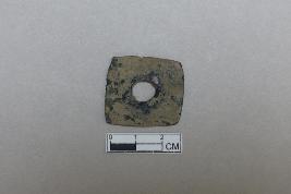 | Description / विवरण | It is a fragment of a miscellaneous object. It is made of copper. It is roughly square in shape and has a hole in the middle. It is partly patinated. It has an even thickness and a rectangular cross-section. The surface of the object is rough. |