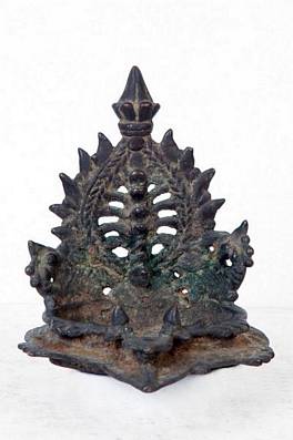 | Description / विवरण | The object is identified as a throne of deity with an ornamented back support by the museum. There is a possibility that this served the purpose of an oil lamp as the object has a V shape projection in the middle which is a most important part of an oil lamp for placing a wick. the bottom of this object is lower than the surface that appears to be unusual for its function as a throne but appropriate for an oil lamp. The decorative back was required to hold the lamp. |