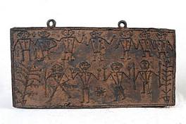 | Description / विवरण | Rectangular copper plate depicting eleven human figures in folkice style. There are two trees on the ach corner of the plate. Two hanging loops are also provided here. |