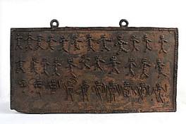 | Description / विवरण | Rectangular copper plate depicting thirty three human figures in different shapes and design. There are also two hanging loops are present. |