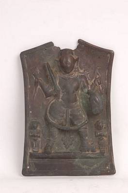 | Description / विवरण | Copper plaque showing Virbhadra form of Shiva. Four armed Shiva holding bow, arrow, sword and shield in their hands. Shiva accompanied by two attendants on either sides. The right side attendant have an animal shaped face. Both are standing with their folded hands. face rubbed. Upper part of the plaque near the head gone. |
